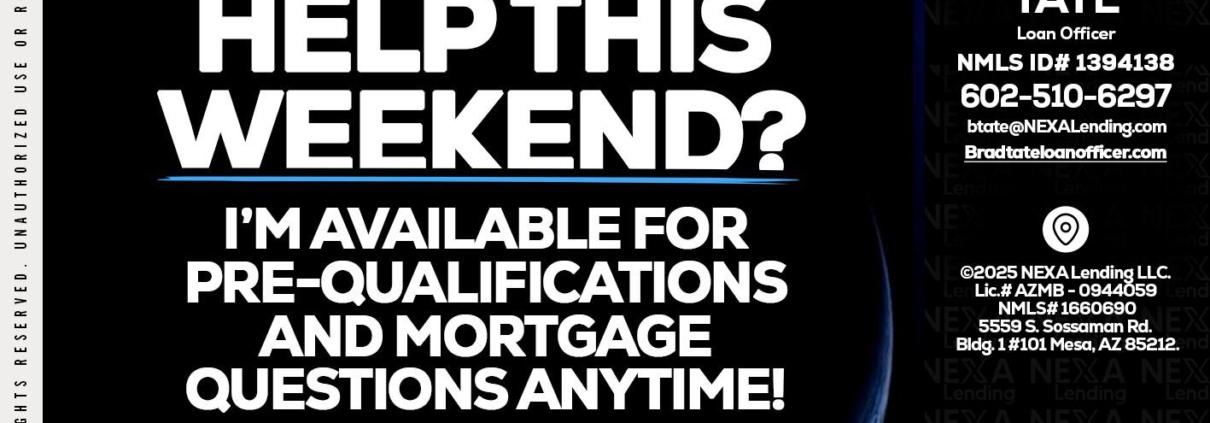 Hi, my name is Brad Tate. I’m a Loan Officer with NEXA Lending LLC., offering personalized mortgage solutions, fast customized quotes, great rates and service with integrity.