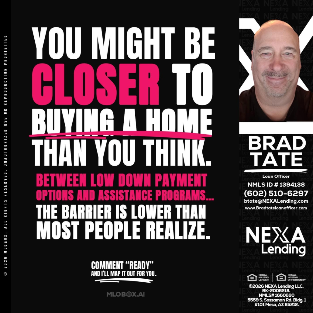 YOU MIGHT BE - Brad Tate -Loan OfficerHi, my name is Brad Tate. I’m a Loan Officer with NEXA Lending LLC., offering personalized mortgage solutions, fast customized quotes, great rates and service with integrity.